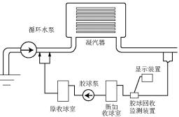 在于開發(fā)一種無需更換原膠球清洗裝置系統(tǒng),可以直接附加在原設(shè)備上的膠球回收自動監(jiān)測系統(tǒng),如圖1所示,它可以自動地監(jiān)測回收膠球的數(shù)量,這樣運行人員就可以根據(jù)檢測結(jié)果適時地添加或更換膠球,保證膠球的數(shù)量以及質(zhì)量,以期達到佳的清洗效果。