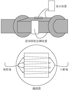 裝置采用對照式光纖傳感器,無膠球通過時,光纖傳感器的入射端發(fā)出的光線能夠被接收端接收,如果有膠球通過,光線被遮擋,接收端接收不到光線信號,即發(fā)出1個脈沖信號,該脈沖波信號傳輸?shù)斤@示裝置增加檢測膠球數(shù),如圖2所示。