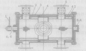 作為此項(xiàng)技術(shù)的研究核心—清洗器的結(jié)構(gòu)設(shè)計(jì)不僅要實(shí)現(xiàn)膠球除垢、水流定向切換和膠球收、放球三者之間的有機(jī)結(jié)合,而且還要與清洗系統(tǒng)相配套。在綜合了熱電行業(yè)冷凝器系統(tǒng)采用的海綿膠球在線清洗技術(shù)的基礎(chǔ)上,將可完成水流定向切換換向閥的結(jié)構(gòu)設(shè)計(jì)引入本清洗器的結(jié)構(gòu)中,在清洗器的內(nèi)部裝上收、放球設(shè)施,依靠清洗器的定向轉(zhuǎn)動(dòng)實(shí)現(xiàn)水流定向切換和膠球收、放球功能,利用循環(huán)水系統(tǒng)以及系統(tǒng)的自身壓力完成對(duì)冷卻器管束的正反向膠球循環(huán)清洗過(guò)程,經(jīng)中試后反復(fù)修改定型。