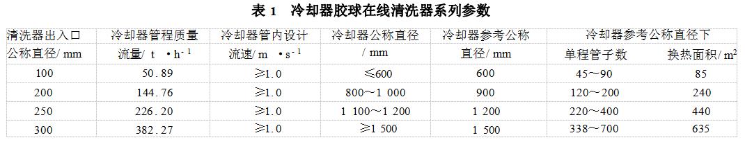 冷凝器自動(dòng)在線膠球清洗裝置系列的主要參數(shù)見(jiàn)表1。值得一提的是該項(xiàng)清洗技術(shù)在煉油化工裝置中塔頂冷凝器系統(tǒng)的使用效果十分顯著,可免除生產(chǎn)過(guò)程中由于冷凝器結(jié)垢而引起的氣體介質(zhì)冷凝效率下降、塔頂氣體壓力升高,進(jìn)而影響裝置的安全生產(chǎn)和產(chǎn)品產(chǎn)量與質(zhì)量等問(wèn)題。