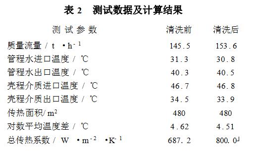 2003年6月在某煉油廠氣分裝置選擇脫丙烷塔1組2臺(tái)串聯(lián)塔頂冷凝器(該部位共計(jì)3組6臺(tái)冷凝器),其型號(hào)為FLB900-240-25-Ⅱ(B=200),管程介質(zhì)為循環(huán)水,進(jìn)口溫度為28~32℃,出口溫度為40~42℃,操作壓力為0.45MPa,質(zhì)量流量為150×103kg/h;殼程介質(zhì)主要為C2+C3,進(jìn)口溫度48~50℃,出口溫度為46~47℃,操作壓力為1.95MPa,質(zhì)量流量25×103kg/h。在1組2臺(tái)串聯(lián)冷凝器管、殼程出入口管線上分別安裝精密水銀溫度計(jì)及超聲波流量計(jì),通過(guò)測(cè)試?yán)鋮s器清洗前、后冷卻器管、殼程出入口介質(zhì)溫度和流量數(shù)據(jù),計(jì)算出總傳熱系數(shù)的變化,以檢驗(yàn)清洗效果。其測(cè)試的平均結(jié)果見(jiàn)表2。