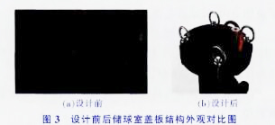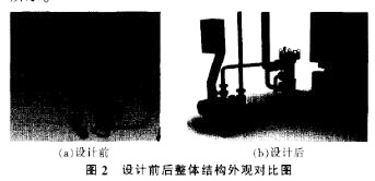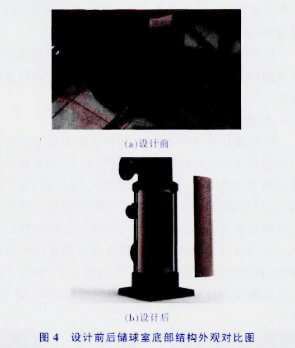 圖2設計前后整體結構外觀對比圖(a)設計前(b)設計后圖1大型中央空調膠球清洗裝置部件圖為增加裝置的美觀度,增加三面不銹鋼裝飾板,將儲球室下端笨重的管道與排水口掩蓋其中。裝飾板通過螺栓與設備連接,可拆卸,這樣既美觀又方便檢修。同時,儲球室油漆材質與反光不銹鋼材質形成強烈的材質對比,如圖4所示。