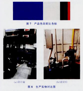 在產品使用過程中人們更容易被產品的色彩所吸引,有助于使用者識別產品,對產品產生聯想。為突出膠球清洗裝置與大型中央空調的區別,避免因環境昏暗給操作者帶來視覺誤差等情況,將裝置的顏色與空調主機箱加以區分。原有產品的色彩較為單調,色彩對比不夠明顯,易令人產生疲勞感。在產品優化設計時將色彩確定為以低純度藍色與不銹鋼原色為主,黑色、中黃為輔進行搭配設計,以保證操作人員對操作對象的分辨力與視覺敏銳度,產品色彩配比色標如圖7所示。