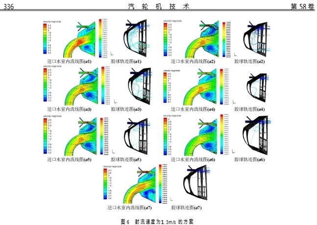 1m/s,a1表示射流速度U=1.3m/s、膠球速度V=1m/s。射流速度為1.3m/s時結(jié)果分析圖6表示對A區(qū)域上部分冷卻管束進行清洗,射流速度為1.3m/s時,送球速度分別為1.0m/s、1.2m/s、1.4m/s、1.6m/s、1.8m/s、2.0m/s、2.2m/s,進口水室內(nèi)的流線圖和膠球軌跡圖。對膠球通過A、B、C、D、E、F6個區(qū)域的情況進行統(tǒng)計,結(jié)果見表1。