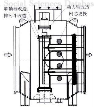 (2)動力軸改造。將原來的二次濾網動力軸(上軸)更改為雙相不銹鋼材質的軸,軸徑由目前的90mm改造為120mm,軸受剪切力F=3.14ro,其中,為屈服強度,r=中/2。經過計算,新軸剪切力約為原軸的1.8倍。軸與減速箱連接尺寸不變。