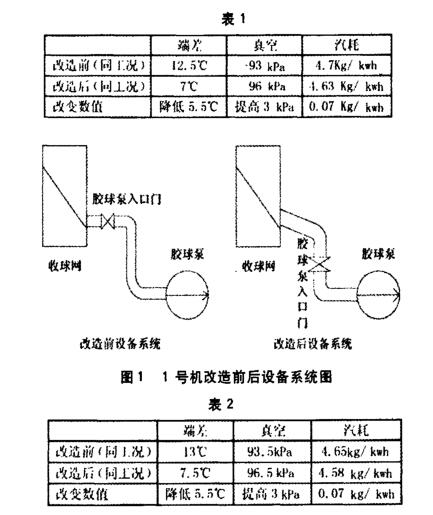 動速度,增大收球網斜坡處流通面積,改造后,2號機膠球收球事95%以上,端差降低了5C左右,真空提高3kPa,降低了汽機汽耗,