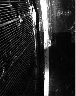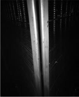 在機(jī)組C修中,通過液壓千斤頂對(duì)收球網(wǎng)網(wǎng)板進(jìn)行初步固定,同時(shí)利用乙炔焰配合大錘敲擊進(jìn)行網(wǎng)板形狀矯正,通過火烤、捶打和液壓裝置固定等矯正手段,使得修后收球網(wǎng)網(wǎng)板的中間間隙均小于2mm,如圖5所示,保證了運(yùn)行期間膠球不會(huì)通過間隙漏至長江。