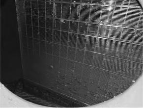 由于長江下游汛期水草雜物多,若循環(huán)水旋轉(zhuǎn)濾網(wǎng)網(wǎng)板間間隙較大會(huì)導(dǎo)致雜物覆蓋收球網(wǎng),嚴(yán)重時(shí)會(huì)導(dǎo)致收球網(wǎng)變形甚至軸承抱死,收球網(wǎng)無法開啟和關(guān)閉到位,從而導(dǎo)致收球率較低。如圖3、4所示,某電廠收球網(wǎng)變形后會(huì)導(dǎo)致收球網(wǎng)網(wǎng)板關(guān)閉不嚴(yán),在收球的過程中,膠球不僅會(huì)通過收球網(wǎng)網(wǎng)板間的間隙漏出,還會(huì)通過收球網(wǎng)與循環(huán)水管壁的間隙漏出,導(dǎo)致收球率較低。