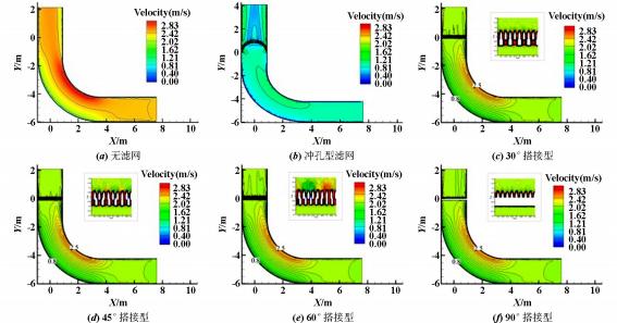 圖3循環(huán)水管道中心截面處速度分布云圖由圖3(c)~圖3(f)可以看出安裝二次濾網時的整流效果與沖孔型濾網截然不同安裝30°和45°搭接角度的二次濾網時濾網后水流速度分布狀態(tài)基本未受影響安裝60°搭接角度的二次濾網時濾網后水流速度分布狀態(tài)受到影響的范圍廣安裝90°搭接角度的二次濾網時管道內、外側水流速度分布相差極大
