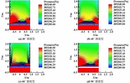 圖4為安裝不同搭接角度二次濾網時循環(huán)水管道中心截面處壓力分布云圖從圖4可以看出不同搭接角度的濾網對濾網后水流壓力場的分布影響不同且壁面附近壓